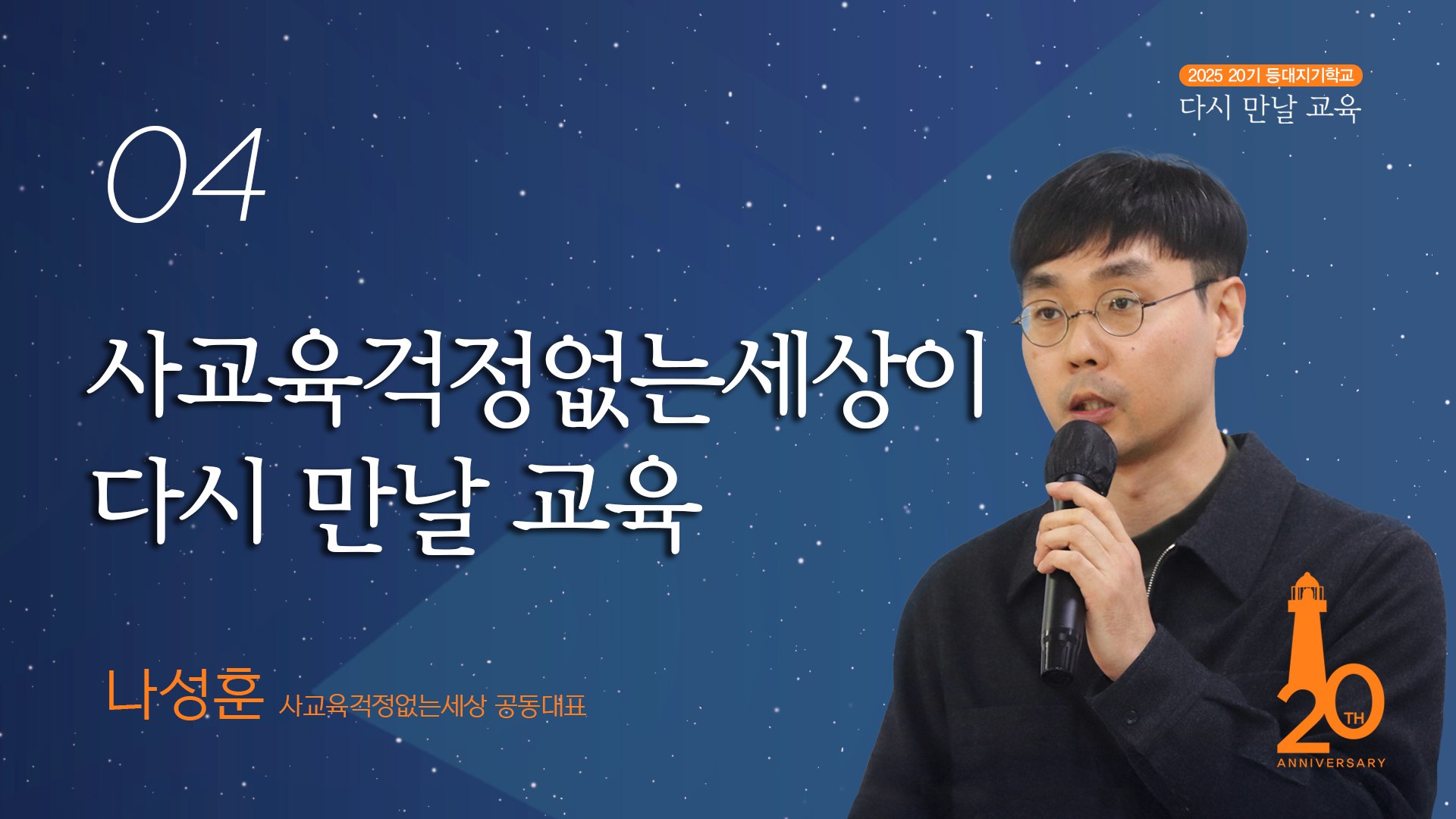 사교육걱정없는세상 홍보국장으로 일하며 전통적 방식의 홍보, 모금, 캠페인을 온라인으로 성공적으로 전환·안착시켰고, 2024년 사교육걱정없는세상의 공동대표가 되었다. 취임 동기로 단체를 향한 '사랑'을 고백했고, 이번 강의에서는 대화, 유대, 다정함을 사교육걱정없는세상의 동력으로 강조했다. 경쟁 교육의 종식으로 나아가는 길에 무엇이 필요할까. 그는 한 사람 한 사람의 가능성, 그리고 관조하며 행동하는 시민의 삶을 언급하며 사교육걱정없는세상이 그것을 결집하는 터로 쓰이고 싶다는 소망을 나눈다. 내면 깊은 곳으로부터 부드러운 운동성을 깨우는 강의.