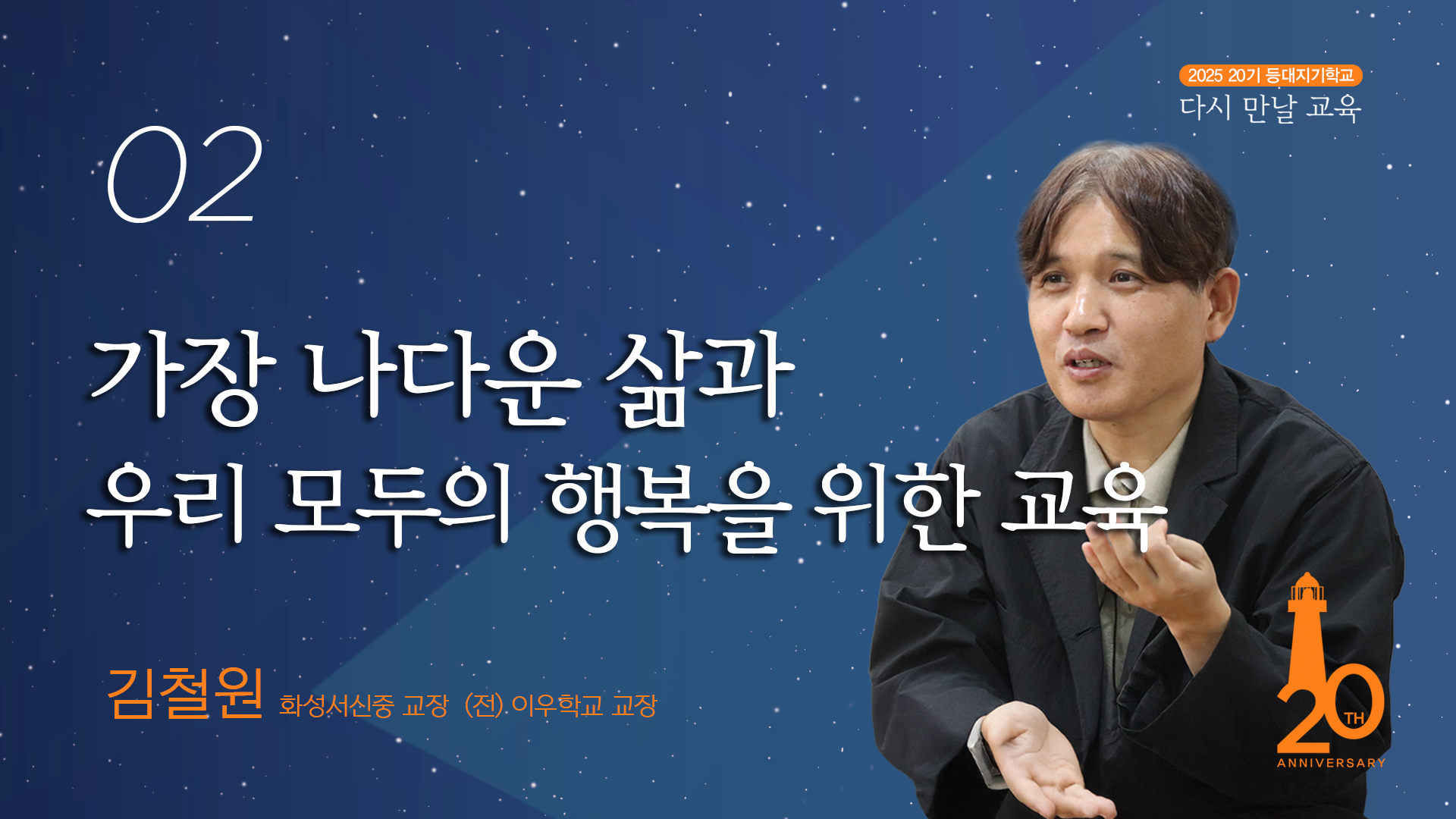 20년간 이우학교에서 근무하며, 학생들을 만날 때 '안녕'이라고만 말하고 지나치기 미안해서 전교생 이름을 외웠다. 현재는 화성서신중 교장으로 근무 중이며 여전히 학생들과 시 창작 수업을 하고 있다. 교사로서 '아이들의 마음속에 걸어 들어갈 수 있는 언어'를 찾고 있는 그는, 이번 강의에서 그 언어의 실체 -학생들과 글쓰기 교실에서 나눈 글-을 통해 '여전히 교육에 있어야 할 것은 관계, 감성, 의미, 가치'임을 힘 있게 전한다. 가장 나다운 삶으로 성장, 더불어 살아가는 세상, 이 두 가지가 우리 교육에서 공존할 수 있음을 깨닫게 된다.