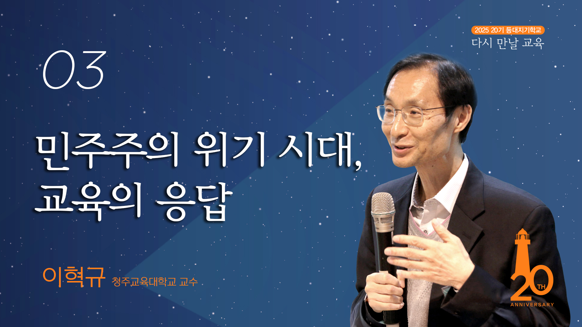 19대 청주교육대학교 총장을 지냈고 한국사회과교육학회 회장을 역임했다. 중고등학교 교사로 10년을 보낸 후 28년 동안 대학에서 예비 교사를 양성해온 그는 이번 강의에서 학자, 선생, 운동가, 그리고 부모의 정체성을 아우르며 한국 사회 현주소에 대한 통찰을 전하고, 인간 본성에 대한 깊은 사유를 펼친다. 이를 바탕으로 제시되는 세 가지 생애 교육: 자존감 교육, 공감 교육, 민주 시민 교육은 우리로 하여금 다시 만날 교육을 고민하고 가정과 교실에서 변화를 만들도록 이끈다.. 교육학적, 인문학적 풍성함이 넘치는 강의.